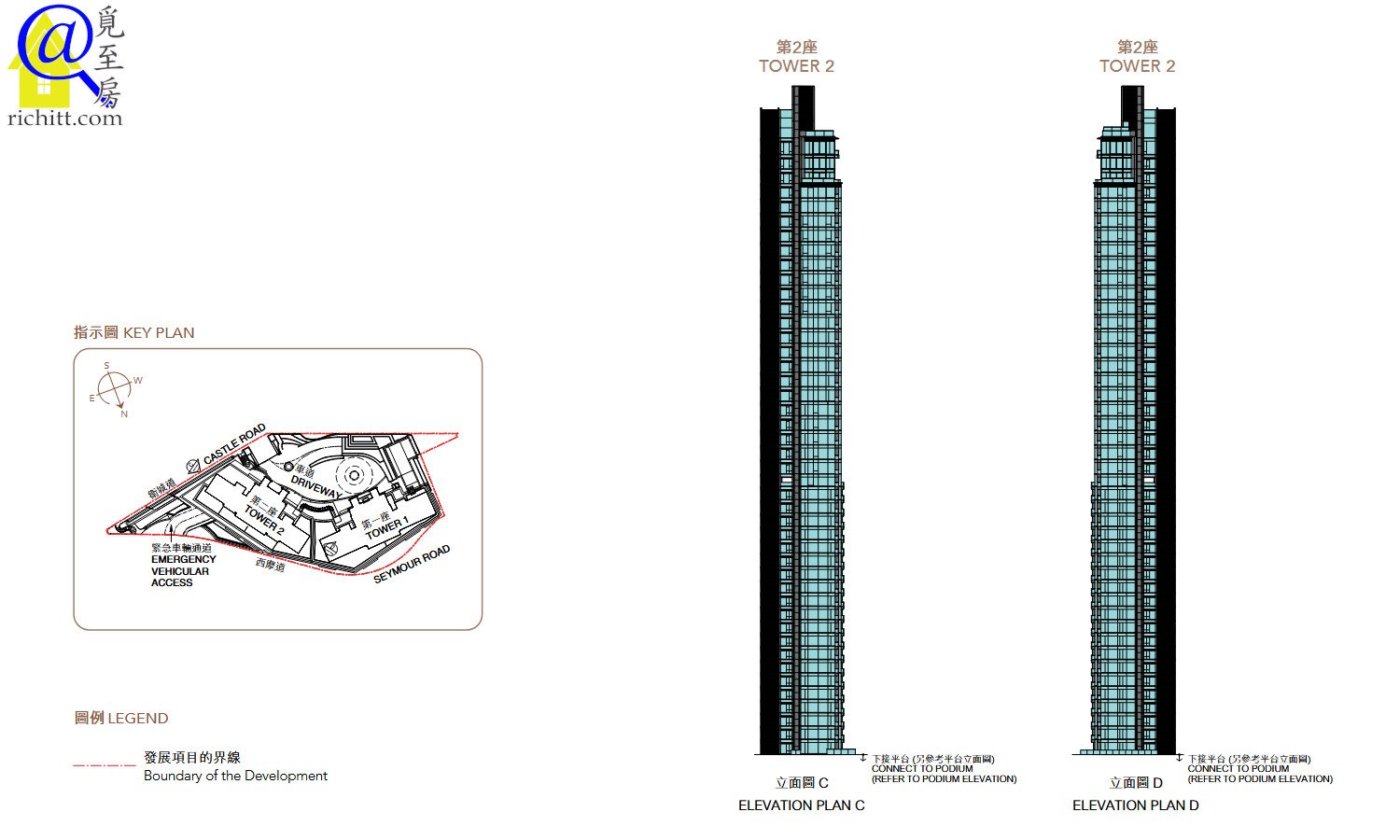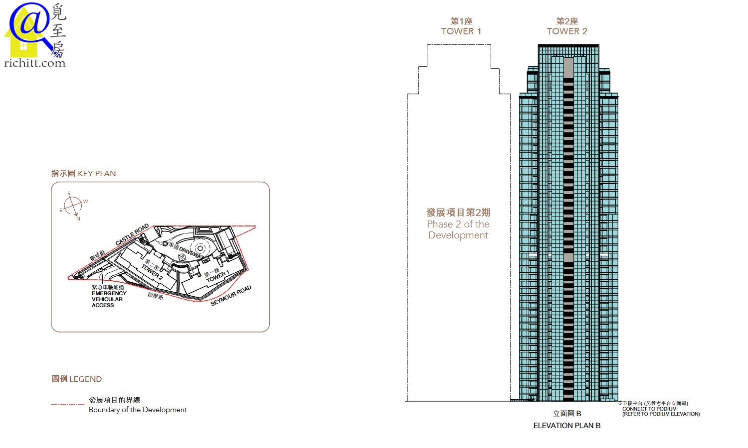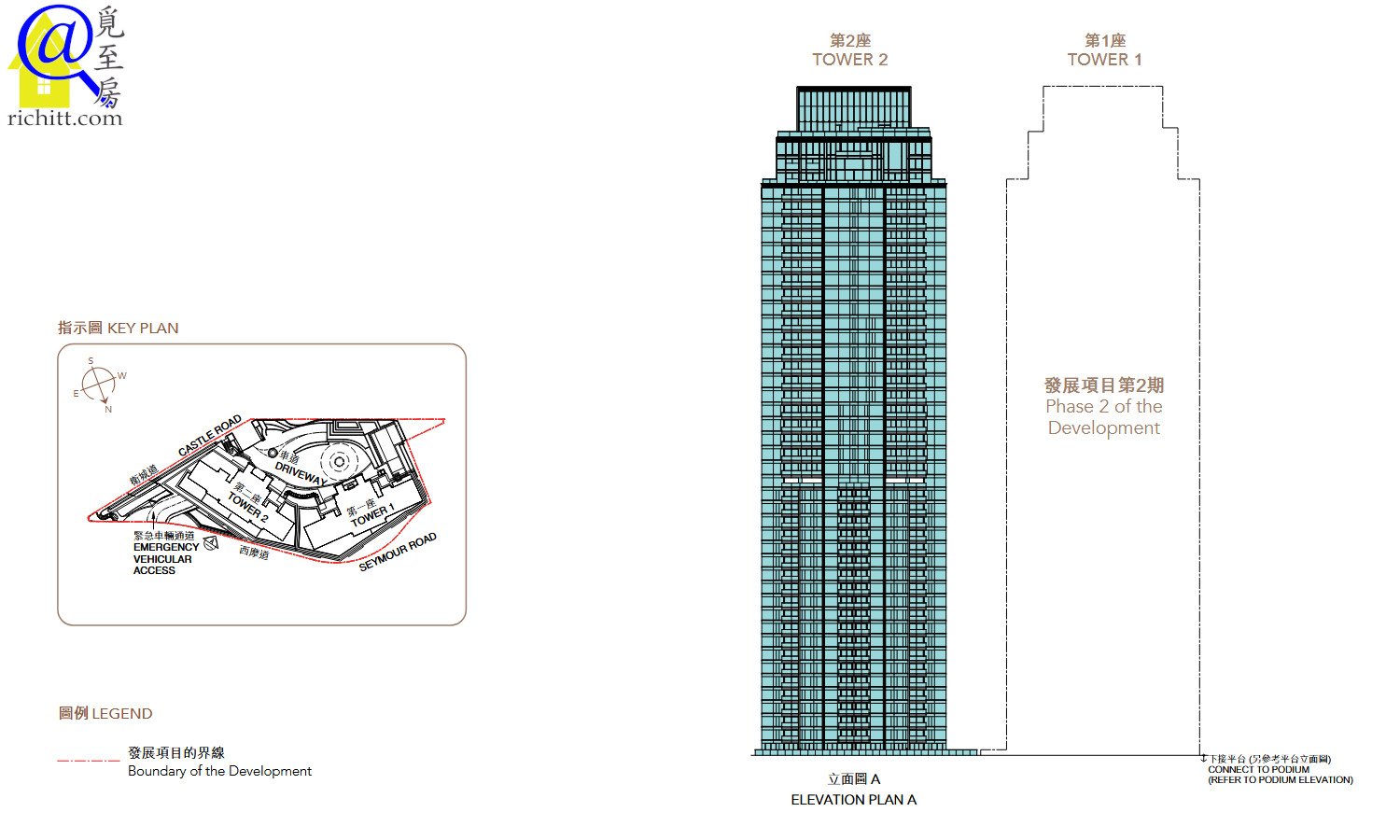 據屋宇署資料,項目將分為兩期發展,各自興建1幢44層高的分層住宅大廈。其中第1期提供較多中型單位,總數96伙之中,有8成屬於實用樓面面積(Usable Floor Area,扣除廚房及廁所後的實用面積,下同)少於900平方呎。至於第2期提供66伙,最細實用樓面面積1,441平方呎起,其中最大的一個單位面積更達7,968平方呎。