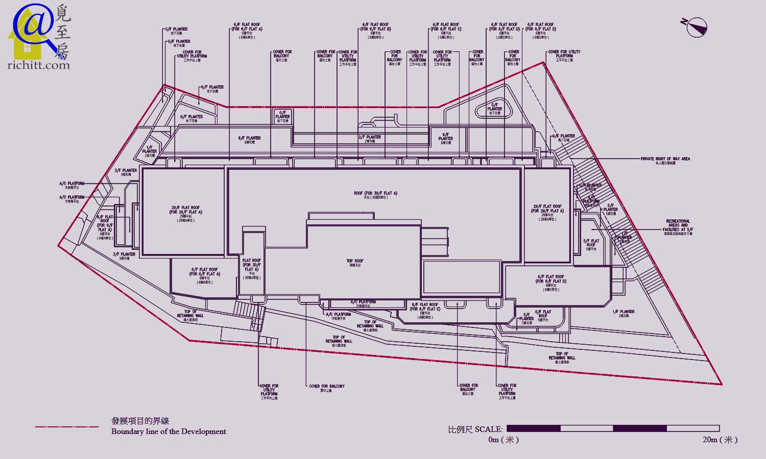 頂層連天台戶僅設1伙,位於30樓A室,實用面積為2,990平方呎,為項目最大單位,設有5間套房、儲物室連廁及化妝間,配置2,308平方呎天台、103平方呎梯屋、45平方呎露台及16平方呎工作平台。值得一提的是天台由內置樓梯連接,並設有室外泳池。
